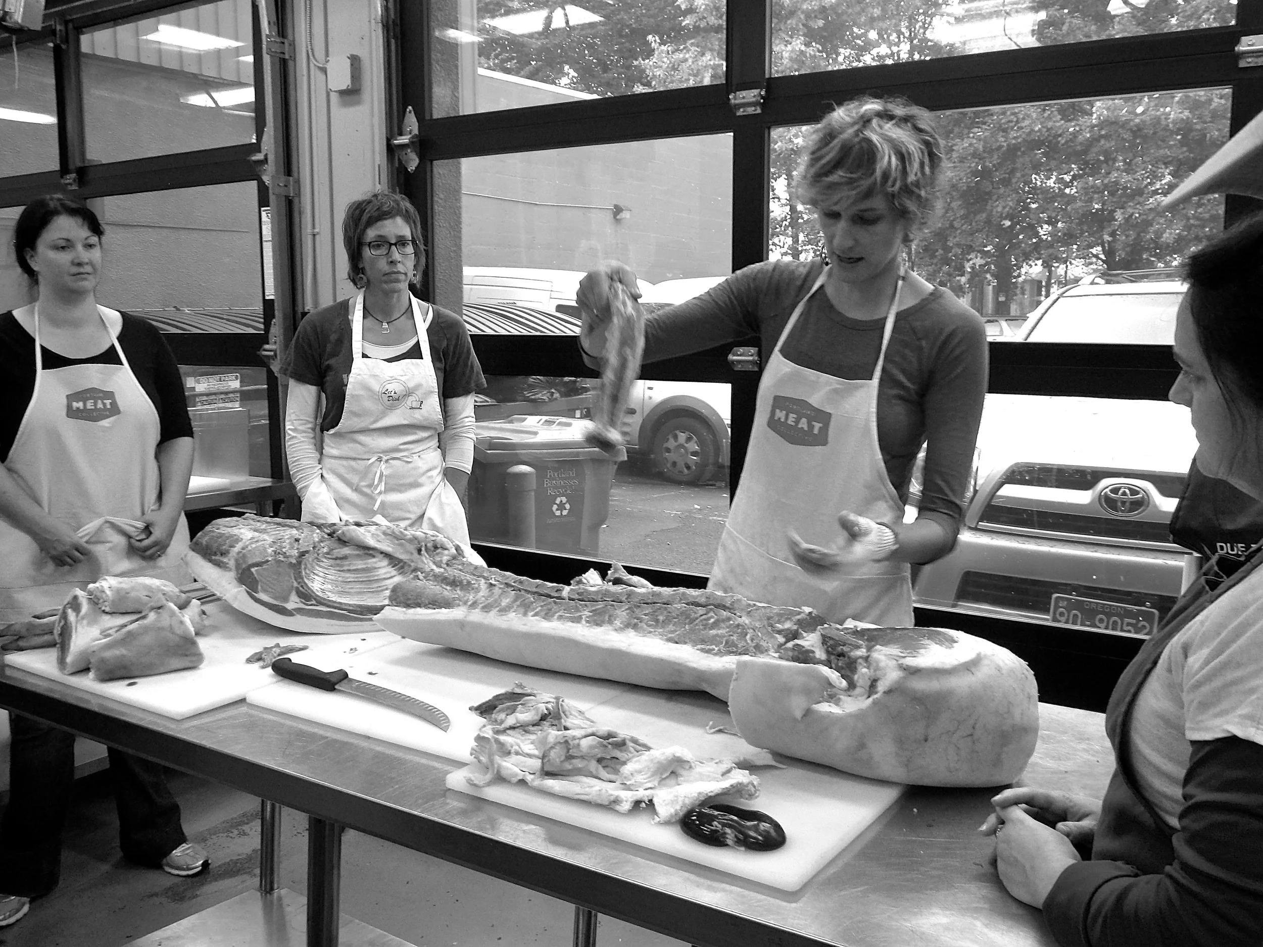 One day I decided I wanted to be a butcher, so I went online and found out about the Portland Meat Collective. Founded by Camas Davis, the Portland Meat Collective is a "network of Portland citizens who are looking for a cost-effective way to buy meat directly from Oregon’s small ranchers and farmers" (from the website). It's also a traveling butchery school! So far I've taken the pig head butchery class, the whole hog butchery class, and a sausage making class. I like that, through these classes, butchery is demystified–if you're going to be a carnivore, you should know where your meat comes from and how to prepare it.
