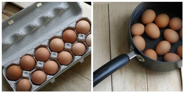 1. Hard boil the eggs. Gently put the eggs in a single layer in a saucepan and cover them with enough water so that there's about 1 or 2 inches of water above the eggs. Heat the water on high until it begins to boil, cover the pan, turn the heat to low, and cook for 1 more minute. Then, remove the pan from the heat and leave it covered for 14 minutes. Chances are you're like me, and are making these deviled eggs for a party and waited until the last minute and really can't afford to chip away at the shells for an hour. No worries! When the 14 minutes are up, drain the hot water and immediately run cold water over the eggs for about 1 minute.