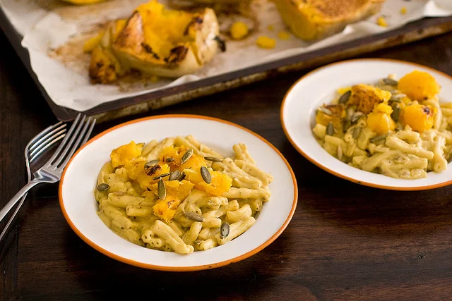 Set aside some of the sauce (you can reserve a cup or so for veggies if you’d like to throw some on top.) Add the pasta, and toss to coat. Serve topped with additional roasted squash and a sprinkle of nuts.