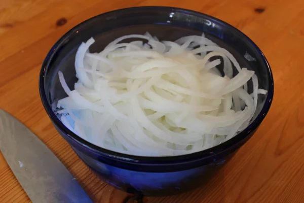 A sharp knife also helps; a dull blade will crush those vacuoles on its way through the onion, releasing more gas than a clean cut would.